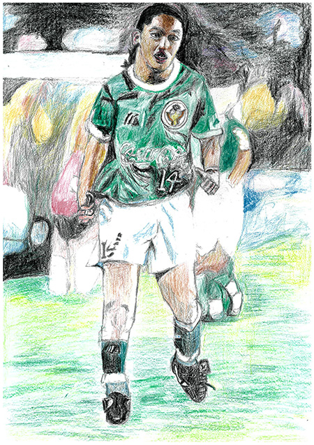 パイオニア=初応募部門の受賞作は、選手の1対1の競り合いを描いたシーン。チームでの戦いというイメージのあるサッカーで、選手個人のプレーに注目した視点が印象的です。作者のkayaranさんは、病気で入院した際にテレビでサッカーの試合を観て勇気づけられたとのこと。「自分もそういうふうな絵を描いてみたい」という想いが、この作品につながりました。