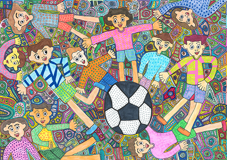 澤穂希賞の作品「カラフル世界でサッカーしたい」は、その色彩の豊かさが特徴です。澤さん自身は絵を描くのが苦手とのこと。「どうやったらこういう色を使って、思った表現ができるのかな」と感心していました。作者のカミジョウさんは、宇宙も地球もカラフルになっており「そういう世界でサッカーを今後もいっぱいできればいいな」という想いを込めたと語ります。