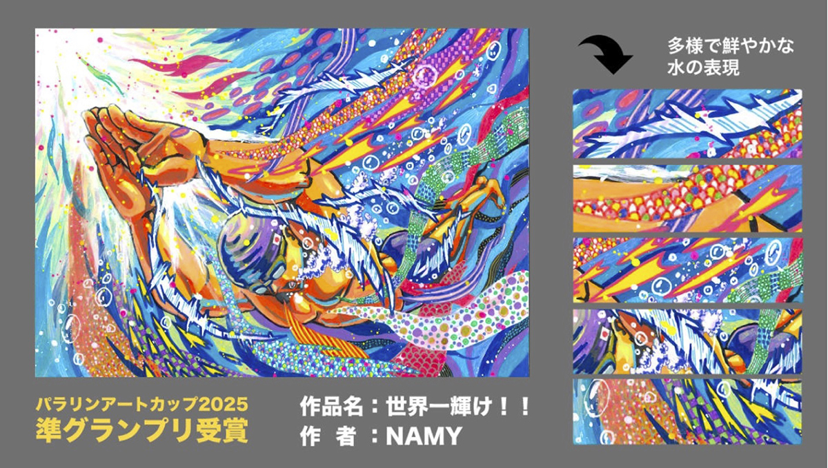 NAMYさんには「パラリンアート世界大会2022」の東海理化賞など、多くの受賞経験があります。これまでも色とりどりに描く画風で制作してきましたが、今回の受賞作品では水泳選手の勢いと力強さが表現されました。ご自身が「全然泳げない」からこそ、「泳げる選手にすごい憧れます」と話します。
